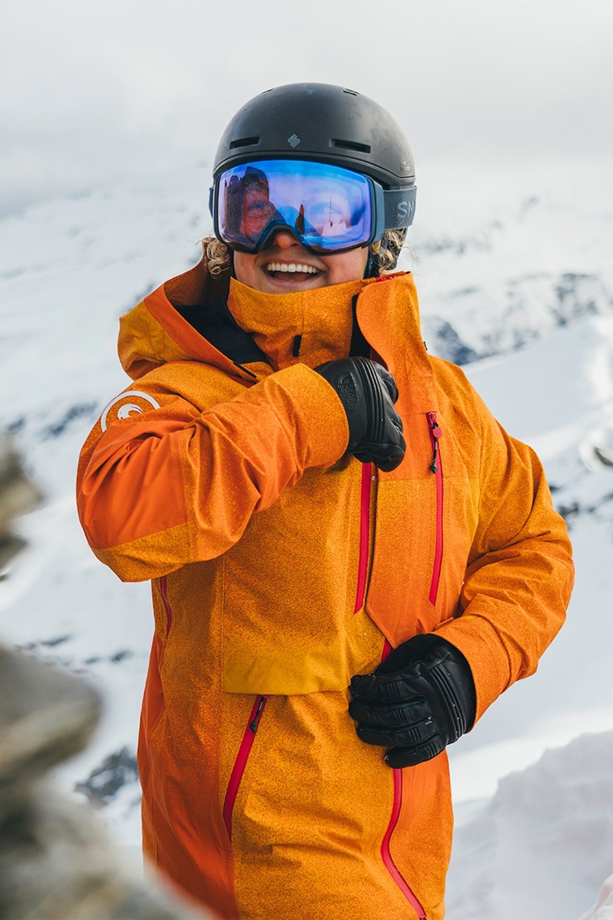A thoughtful pocket layout includes chest and hand pockets, a sleeve pass pocket, and an integrated goggle wipe for easy organization. A stretch powder skirt, wrist gaiters, and RECCO reflector add reliable protection and safety.