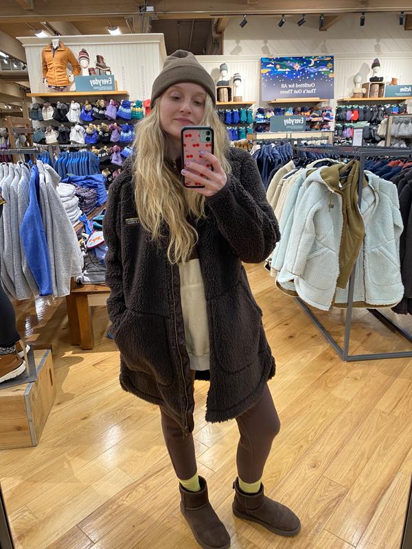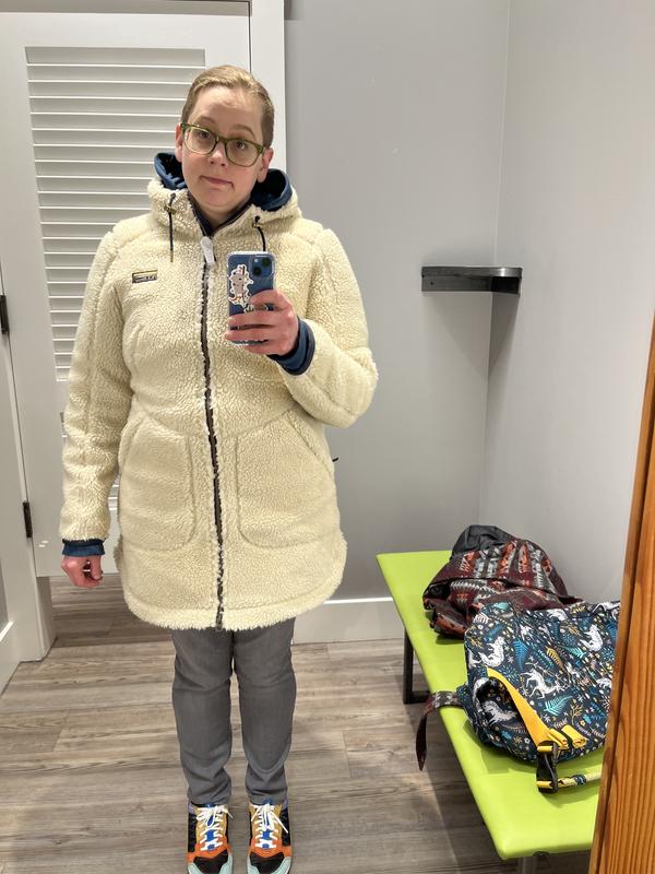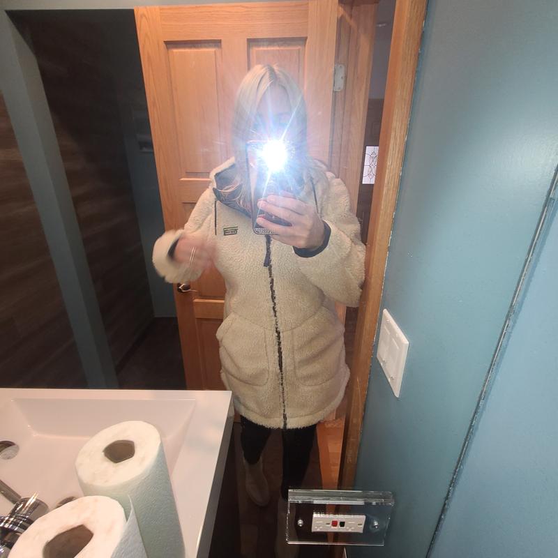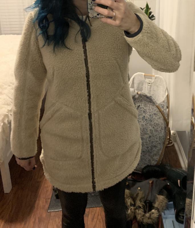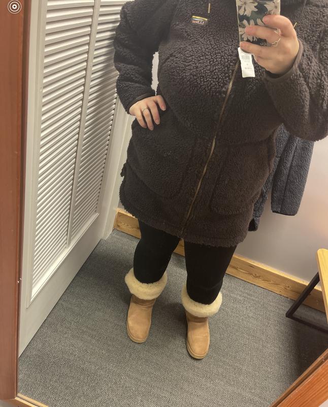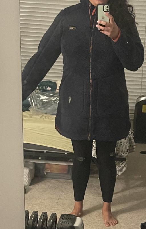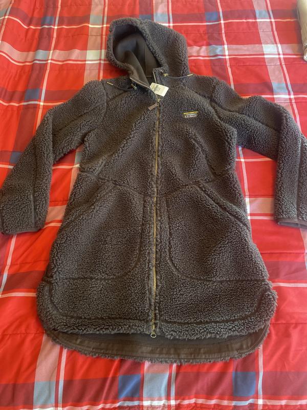 I love the design of this fleece: the color,the length is great as is the depth of the pockets. Well sewn as is most LL Bean merchandise. However, it has a major sticking point for me. The fleece itself has a backing of really heavy almost neoprene lining that is directly attached to the fleece. It is extremely heavy and cumbersome to wear is not warm and cozy which was what I was expecting Also, it is not their usual sizing. I am normally small to medium and this runs snug . I am so disappointed in this and will be returning it